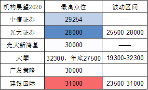 中信证券认为恒指有10%涨幅(大约在29254点左右);光大证券陈治中表示,恒指的主要波动区间仍将在25,500 ~ 28,000点之间;光大新鸿基温杰表示,2020年恒生指数全年的目标为30,000点;国企指数全年的目标为12,000点,而上证综合指数全年的目标为3,400点。国信证券更是表示,港股2020将迎全面牛,以历史PB计算,恒指有望在2021年站上40000点大关。