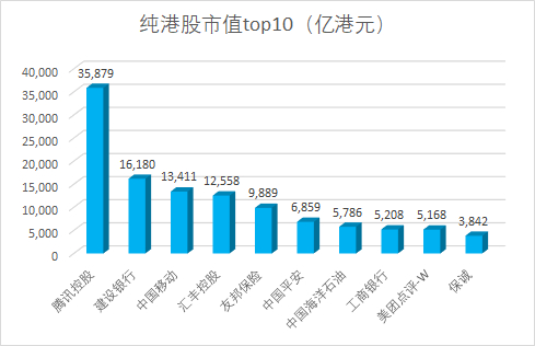 如果以纯港股市值计算,腾讯控股依然是港股股王,建设银行港股市值16180亿港元,位列第二;中国移动位列第三,汇丰第四,友邦第五。中国平安港股市值6859亿港元,位列第六;中海油市值5786亿,位列第七;工行港股市值5208亿港元,位列第八;美团点评市值5168亿港元,位列第九;保诚第十,市值3842亿港元。
