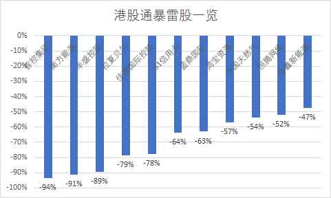 2019年,港股暴雷股不断,港股通也不乏暴雷股。其中,首控集团第一大股东质押股份被券商斩仓,导致股价一日暴跌逾70%。南方能源被沽空、券商斩仓,股价大跌91%;丰盛控股债务危机;拉夏贝尔多家子公司资本抵债,业绩巨亏;一度传言是因为佳源国际债务违约,公司股价暴跌,不过公司估值虚高、负债高企对股价造成极大沽压。51信用卡暴力催收风波以及仰智慧失踪等也相应打压了对应公司股价。