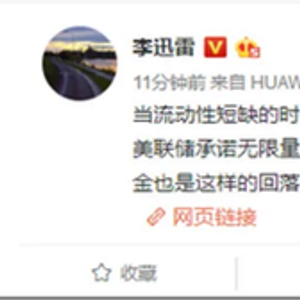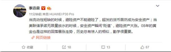 中泰证券研究所所长、首席经济学家李迅雷在其微博表示,当流动性短缺时,避险资产无法避险,超发的货币便成为安全资产,当美联储承诺无限量放水时,安全资产瞬间“贬值”,避险资产自然大涨。