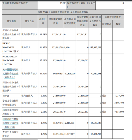 根据康龙化成中期报告,公司第一大机构股东为中信证券,旗下信中康成持股19.78%,信中龙城持股3.59%,合计持股23.37%。君联资本旗下君联闻达、君联茂林合计持股13.39%。君联闻达、君联茂林和 Wish Bloom 均为联想控股旗下君联资本的旗下公司。