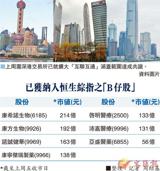 现时在主板上市、并未有盈利的生物科技公司,在编号后面会有一个“B”以资识别,市场俗称“B类股”,未来将可进入互联互通的范围内。沪深港3家交易所上周就此达成共识,同意属恒生综指成份股、或在内地有发行A股的“B类股”,将可纳入“港股通”范围,预计1个月后生效。
