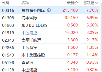 1月14日消息,港股航运及港口板块逆市走高,东方海外国际涨7.7%,海丰国际涨近7%,中远海控涨超3%,太平洋航运涨超2%,中远海发涨超1%。