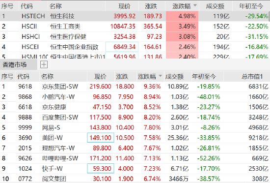 美债收益率下跌,科技股反弹,恒生科技指数走高涨超5%,京东集团涨超9%,小鹏汽车、百度集团、京东健康等涨超8%,网易、美团、理想汽车、哔哩哔哩涨超7%。
