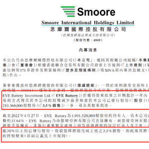 思摩尔国际(06969)公布,董事会获亿纬锂能(300014.SZ)通知并注意到,亿纬锂能于今天宣布,亿纬锂能将就其全资附属公司EVE Battery Investment Ltd.(EVE Battery)于获得股东批准之日期起计一年内,通过大手交易的方式将其于该公司的股权减少最多相当于公司已发行股份总数3.5%(约2.1亿股股份)一事,寻求其股东批准。