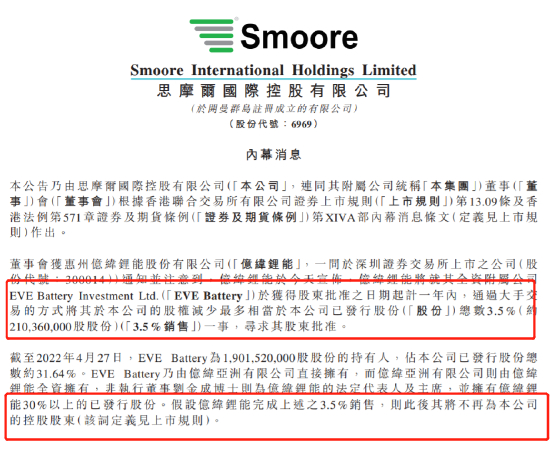 截至2022年4月27日,EVE Battery为19.015亿股股份的持有人,占公司已发行股份总数约31.64%。EVE Battery乃由亿纬亚洲有限公司直接拥有,而亿纬亚洲有限公司则由亿纬锂能全资拥有,非执行董事刘金成博士则为亿纬锂能的法定代表人及主席,并拥有亿纬锂能30%以上的已发行股份。假设亿纬锂能完成上述的3.5%销售,则此后其将不再为公司的控股股东。
