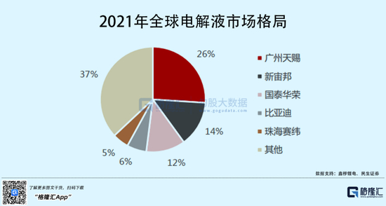 得益于此,全球电解液出货量不断增长,由2015年的11.08万吨增长至2021年的56.8万吨,年复合增长率达到31.2%。其中,中国锂电池电解液的出货量占比高达80%以上,可以看到,全球电解液市场前五大席位都被国内厂商所占据,天赐材料、新宙邦、国泰华荣(瑞泰新材子公司)排名前三,市占率分别为26%、14%、12%。