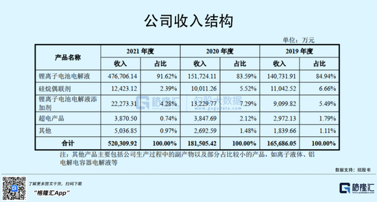 其中,锂离子电池电解液贡献公司收入的绝对大头,2021年收入占比提升至91.62%;相应的硅烷偶联剂、锂离子电池电解液添加剂的收入规模增长不及锂离子电池电解液,进而导致收入占比下滑,分别为2.39%、4.28%;超电产品及其他目前收入规模很小。