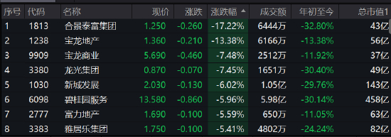 内房股集体大跌,合景泰富跌超17%,宝龙地产跌超13%,宝龙商业、龙光集团跌超7%,新城发展跌7.45%,碧桂园服务跌近6%,富力地产、雅居乐等纷纷跌超5%。