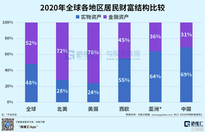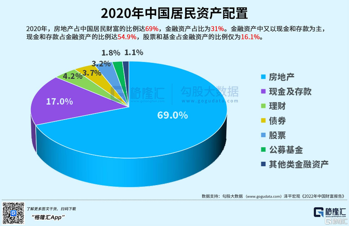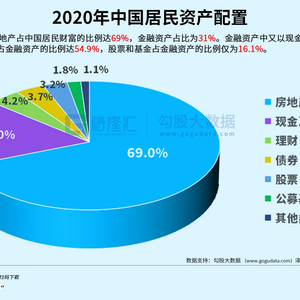 2020年,房地产占中国居民财富的比例达69%,金融资产占比为31%。金融资产中又以现金和存款为主,现金和存款占金融资产的比例达54.9%,股票和基金占金融资产的比例仅为16.1%。