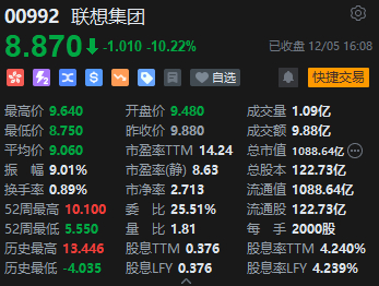联想集团挫逾10%领跌科指成分股。根据香港联交所披露的文件,杨元庆于11月28日以每股均价9.7892港元售出联想集团1,141.8万股普通股股份,价值约1.12亿港元。另外,其于11月29日以每股均价9.6702港元售出858.2万股普通股股份,价值约8298.97万港元;11月30日以每股均价9.6846港元售出600万股普通股股份,价值约5810.76万港元;及12月1日以每股均价9.6506港元售出600万股普通股股份,价值约5790.36万港元。
