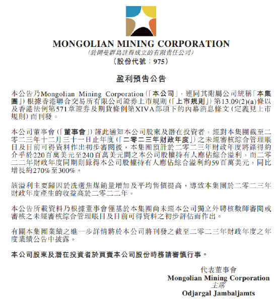 蒙古焦煤股价跌超20% 预计去年股东应占溢利约2.2亿美元至2.4亿美元