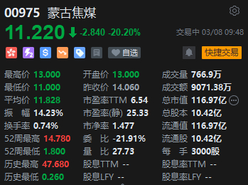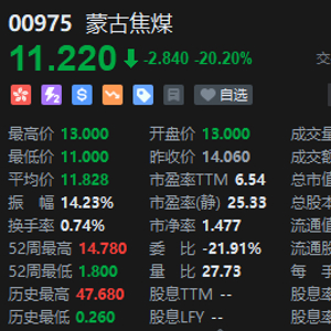 3月8日消息,蒙古焦煤股价跌超20%,报11.22港元,成交额9071.38万港元,总市值116.97亿港元,值得注意的是,该股年初至今涨幅逾80%。