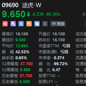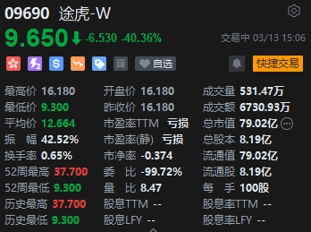 3月13日消息,截至发稿,途虎-W股价跌超40%,报9.65港元,成交额6730.93万港元,总市值79.02亿港元,开年以来股价已跌去六成。