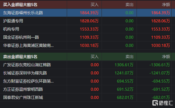 海天瑞声获沪股通净买入1828万元,机构净买入1553万元。