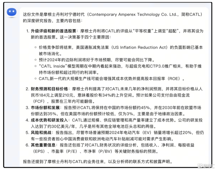 有财经大V将此前大摩唱多宁德时代的英文原版研报扔给Kimi,让其总结要点,结果它总结得非常有条理,关键信息也都提炼出来了。
