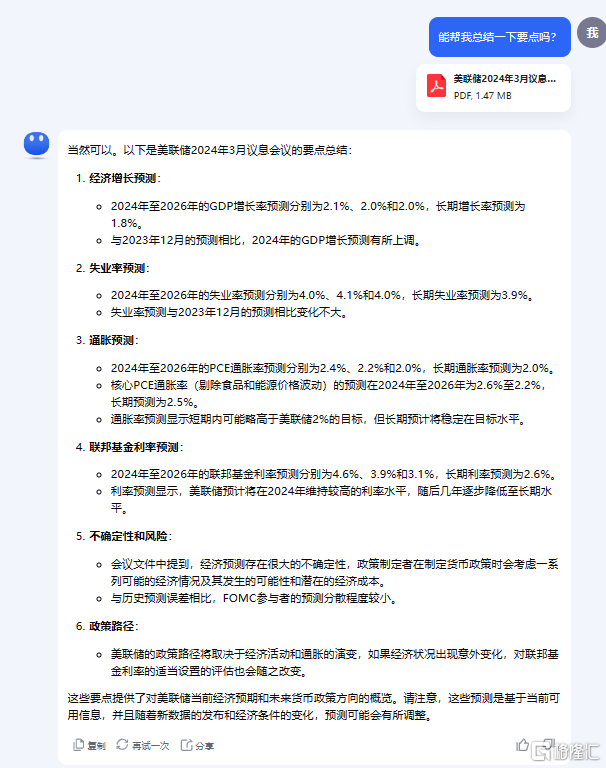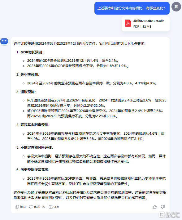 笔者也尝试把凌晨的美联储3月政策声明和此前12月的声明一起丢给Kimi,让其对比分析,从结果来看,它对文件内容的信息点提取得非常精准。