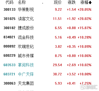 截至发稿,华策影视2连板,掌阅科技2连板,中广天择2连板,海天瑞声涨14.99%,福昕软件涨9.08%,中文在线涨3.52%,深信服涨2.59%,九安医疗涨6.98%,金山办公涨3.51%,华宇软件涨3.16%。