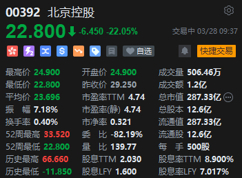 3月28日消息,截至发稿,北京控股直线下挫22%,报22.8港元,成交额1.2亿港元,总市值287.33亿港元。
