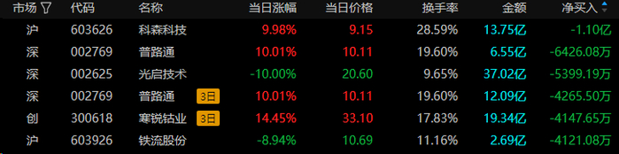 龙虎榜净卖出额前三为科森科技、普路通、光启技术,分别为1.1亿元、6426.08万元、5399.19万元。