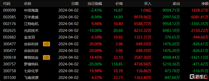 低位挖掘:净买入东方锆业、江特机电、利元享、广和科技,分别为5355万元、5328万元、3504万元、2157万元,净卖出北方铜业3043万元