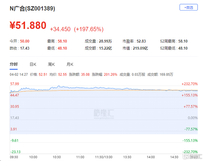 广合科技:上市首日涨197.65%登上龙虎榜,换手率78.51%,成交额15.22亿元龙虎榜数据显示,当日上榜营业部全天成交2.38亿元,占当日总成交金额比例为15.62%。其中,买入金额为1.99亿元,卖出金额为3869.99万元,合计净买入1.60亿元。机构合计净买入1308.54万元。
