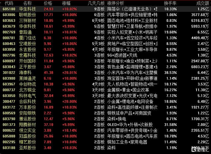 焦点股方面,华生科技晋级9连板,联明股份6连板,三祥新材6天5板领涨固态电池板块,华体科技、普路通5连板,厦门信达4连板。