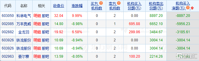 龙虎榜中涉及机构专用席位的个股中,当日净卖出额前三为万丰奥威、金龙羽、铁流股份,分别为5956.23万元、3185.61万元、3004.14