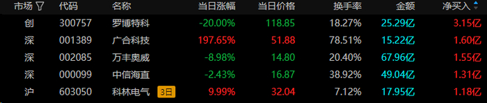 今日龙虎榜净买入额前三为罗博特科、广合科技、万丰奥威,分别为3.15亿元、1.60亿元、1.55亿元。