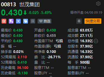 4月8日消息,世茂集团遭建银亚洲提清盘呈请,早间低开5.49%,报0.43港元,成交额27.11万港元。