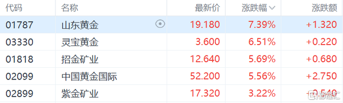 港A股市场上,黄金股也同样延续近期的涨势。港股中的山东黄金涨7.39%,灵宝黄金涨超6%,招金矿业、中国黄金国际涨超5%。