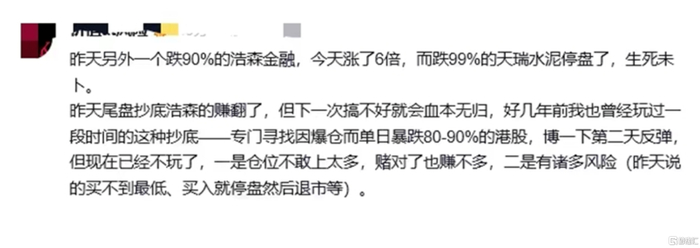 也有投资者发文告诫称,抄底这样的个股有诸多风险,比如买不到最低、买入就停盘然后退市等。