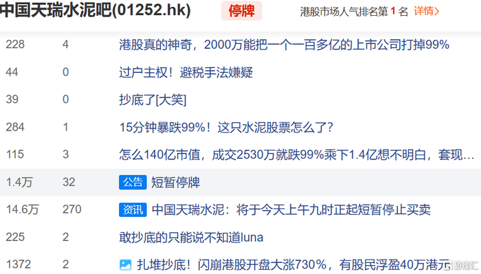 昨日,中国天瑞水泥自下午3点45分左右股价呈现断崖式下跌,最终收跌99.04%,总市值由超140亿港元蒸发至仅剩1.4亿港元。
