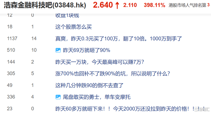 其中,浩森金融科技昨日一度暴跌95%至0.29港元,最终收跌90.96%,全天成交仅67.33万港元,市值仅剩8299万港元。