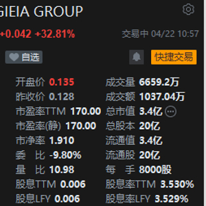 4月22日消息,HYGIEIA GROUP连续两个交易日大涨,现涨近33%,成交额超1000万港元,总市值3.4亿。