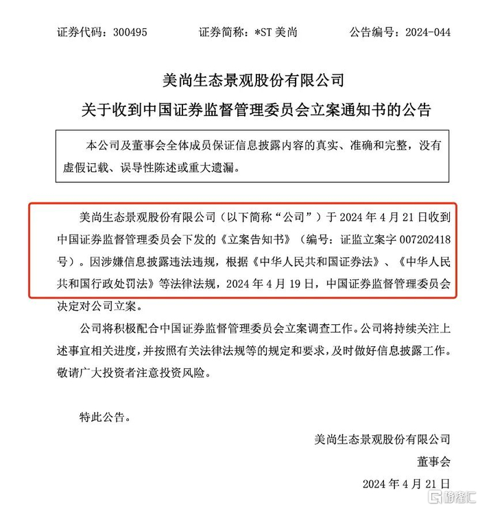 消息面,4月21日晚,美尚生态公告,公司于当日收到中国证监会下发的《立案告知书》,因涉嫌信息披露违法违规,中国证监会决定对公司立案。与此同时,其还发布公告称,公司收到深圳证监局行政监管措施决定书,深圳证监局对美尚生态景观股份有限公司采取责令改正措施。