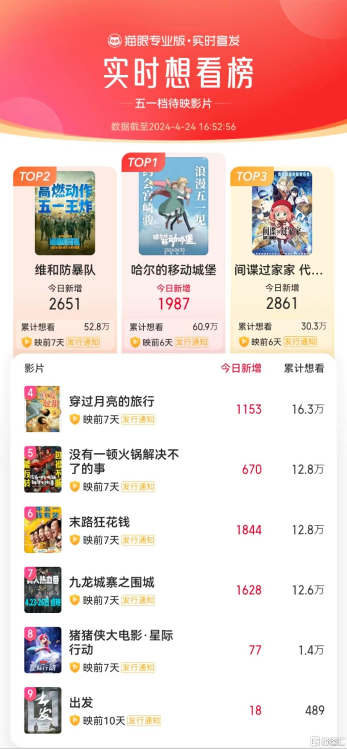 其中,《哈尔的移动城堡》、《维和防暴队》、《间谍过家家 代号:白》分别位列“想看榜”前3位。