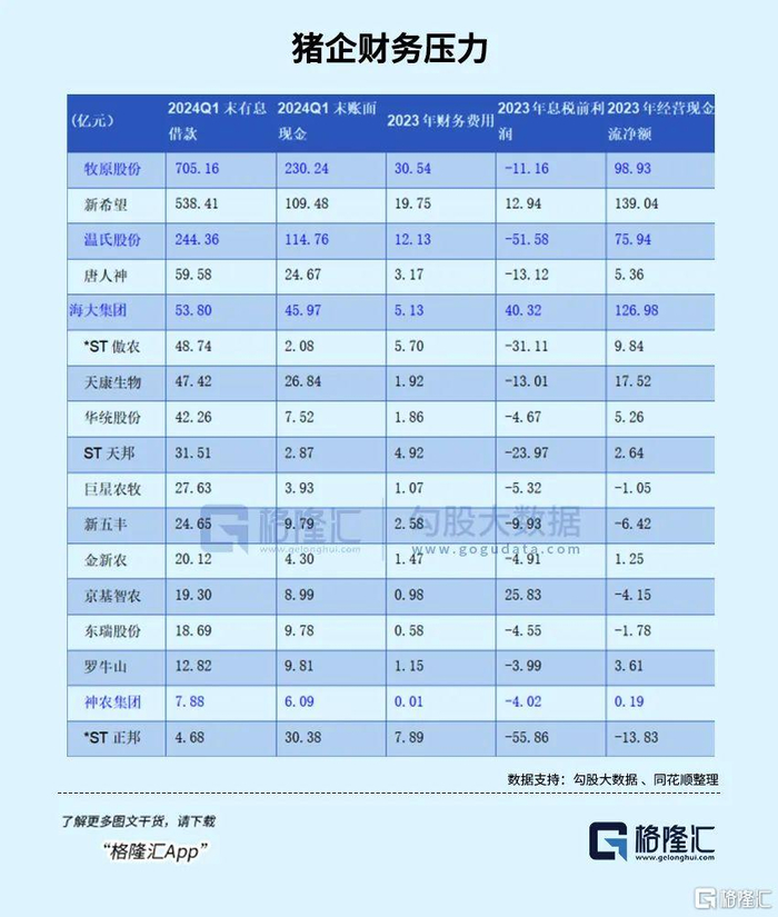 小猪企里,神农2024Q1末有息借款7.88 亿,2024Q1末账面现金6.09亿,2023年息税前利润 -4.02 亿,2023年经营现金流净额0.19 亿,的财务压力最小;