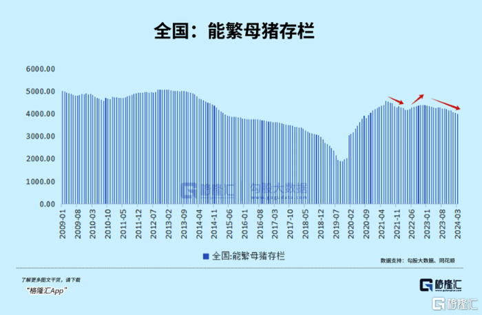根据农业农村部数据显示,截至2024年一季度末,全国能繁母猪存栏量降至3992万头,较2022年年底又下降约9%。