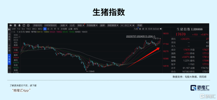 因为生猪价格又涨起来了。国家统计局5月14日发布数据,2024年5月上旬与4月下旬相比,生猪(外三元)本期价格为15.0元/千克,环比上涨0.7%。