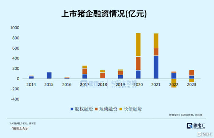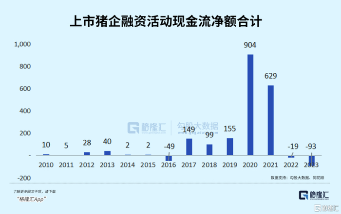 统计数据显示,这两年上市猪企的融资情况,接近千亿级别,比过去10年的总和还要多。那个时候,应该算是养猪企业有史以来最财大气粗,拿钱拿到手软的两年。