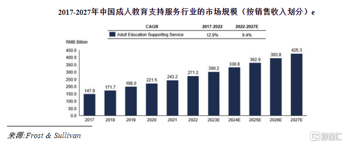 按销售收入计,我国成人教育支持服务行业的市场规模由2017年的人民币1478亿元增长至2022年的人民币2712亿元,复合年增长率为12.9%,预计到2027年将增长至4253亿元,2022年至2027年的复合年均增长率为9.4%,较之前有所下降。
