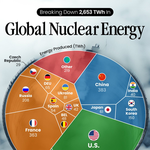 根据核能研究所更新至2022年8月的数据,全球核电发电量达2653TWh,下图展示了全球最大的核能发电国家TOP15。
