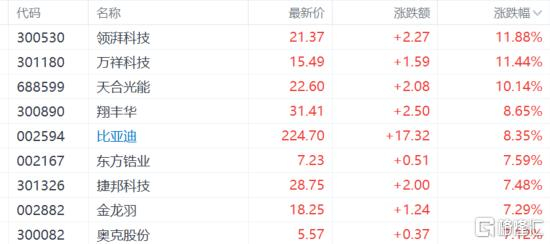 截至收盘,领湃科技、万祥科技大涨超11%,天合光能大涨10%,翔丰华、比亚迪大涨超8%,东方锆业、捷邦科技、金龙羽、三祥新材等涨超7%。