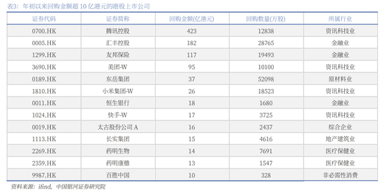 总体来看,港股市场中,年初以来回购金额超10亿港元的上市公司有13家,龙头公司加码回购的趋势显著。