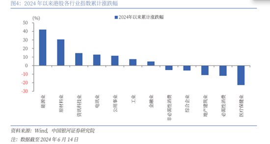 行业层面,2024年以来,截至6月14日,多数行业获得中介机构加仓。港股通方面,以持股市值变动衡量,重点加仓能源业、金融业等高股息板块以及资讯科技业。以持股市值变动比例衡量,能源业、公用事业和原材料业增持幅度较大。仅医疗保健业被南向资金减持。