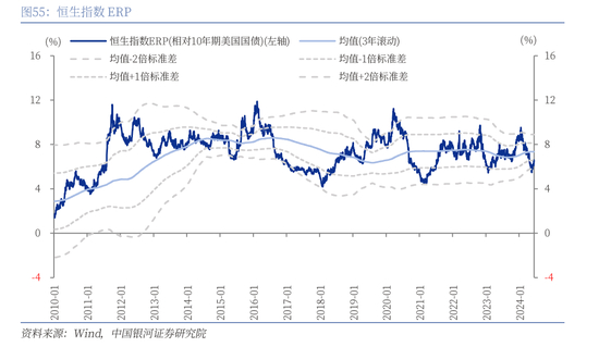受市场情绪波动较大影响,恒生指数ERP指标在1月下旬达到高点,随后显著回落,近期在市场震荡调整态势下稍有回升,截至6月14日,恒生指数ERP为6.58%,位于3年滚动均值-1倍标准差左右。市场情绪已明显修复,下半年风险溢价下行空间或有限,从股债性价比的维度来看,港股优势不显著。