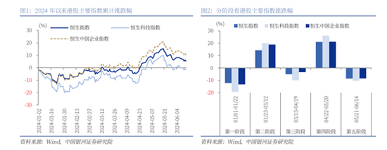 2024年以来,截至6月14日,恒生指数累计上涨5.25%,恒生科技指数跌1.51%,恒生中国企业指数涨10.51%。从上半年来看,指数走势可以大致划分为五个阶段: