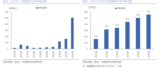 回购通常向市场传达股价被低估的积极信号,大额回购的公司增加,更是让投资者进一步认识到港股市场的投资价值,有助于促进股价稳定并提振市场信心。同时,回购也为港股市场资金面提供一定支撑作用,对股价产生正面的推动效应。展望2024年下半年,产业资本回购热潮有望持续,从而提振港股市场行情。