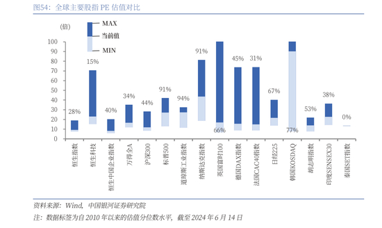 2024年以来,港股市场情绪已部分修复,叠加下半年地缘因素与美国大选的不确定扰动,风险溢价回落空间或将受限。港股当前估值处于历史中低区间,在全球主要股指中估值相对较低,对于全球资金的吸引力更大。下半年的估值上涨空间仍需等待美联储更为明确的降息信号。